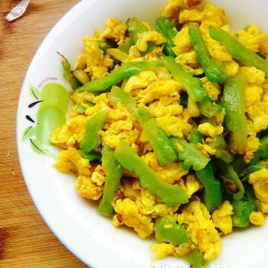 苦瓜炒软后下入炒好的鸡蛋,加盐炒匀,加少许香油出锅。