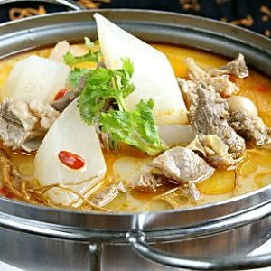 3、食用时,取出部分羊肉、羊肠、羊肚块放入热汤锅内烫热,盛在碗内,舀入热羊肉汤,加入适量的盐、味精调好口味,撒上香菜段,再取出部分盐水椒装入小碗,同时上桌,配合食用。