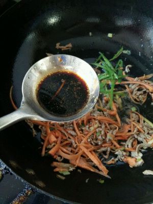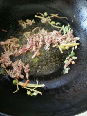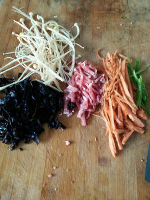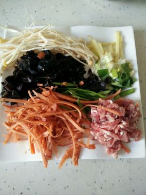 将肉切丝,木耳泡发切丝,胡萝卜青椒切丝,家里还剩点金针菇一起来!