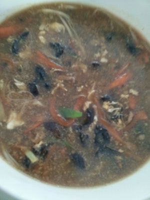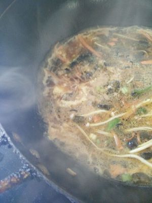 填水,如果有高汤最好加入高汤!放入金针菇和木耳丝!