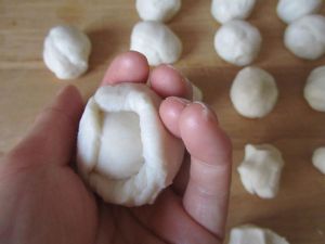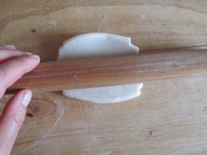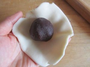 将油皮擀成圆形,将油酥团成球状放在中心;