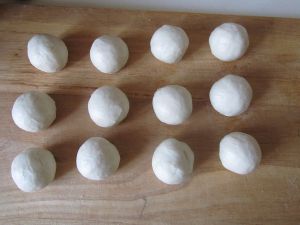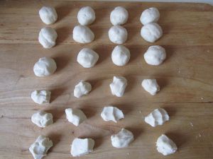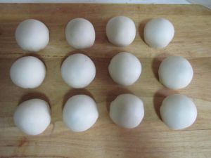 分割称量:将松弛好的油皮, 油酥各分成12小份;