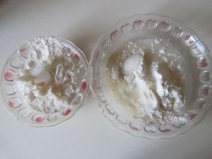 分别将油皮和油酥皮的原料称量好分别放入两个盆中, 将它们分别混合好;