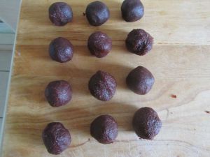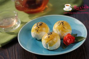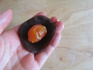 将豆沙馅按压成圆片, 包裹住咸蛋黄;