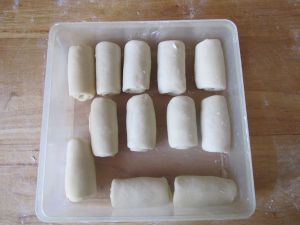 再将长条面团收口向上再擀成长条状, 再卷起来后放入盒中加盖继续松弛十分钟;