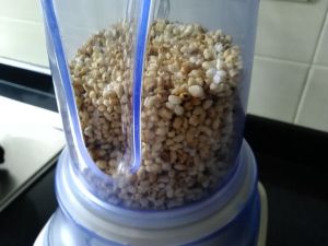 炒好的糯米放凉后,倒入料理机的碾磨杯中进行打碎(打出来的的颗粒要粗点)