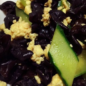 锅里倒油,油热后倒入木耳和黄瓜片,翻炒,加入1勺盐,约1分钟后倒入鸡蛋块,淋入1勺味达美,加少许白糖,翻炒均匀出锅