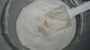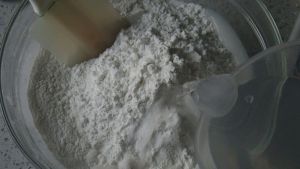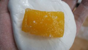 黄桃切小块,沾裹糖粉,制成水果馅儿