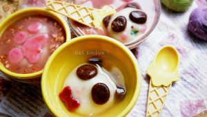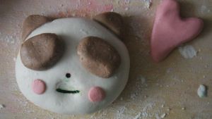 取棕色、红色小面团,做出熊猫耳朵、眼睛、腮红,粘合起来(揉一揉捏一捏感觉在玩橡皮泥 哈哈)