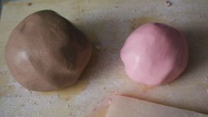 取部分面团,分别加可可粉,红曲粉,揉成棕色、红色面团(可以使用食用色素制作需要的颜色)