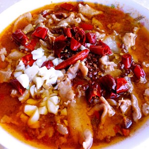在另起锅倒上油,把油烧盛八成热浇在菜上面,这一道香辣劲爽的水煮肉就做好啦!赶快试试吧!