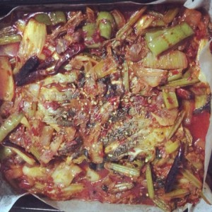 锅内放油,爆炒香葱姜蒜,加洋葱青辣椒爆炒后盛出,放郫县豆瓣酱,加半碗水,再倒回青椒洋葱和焯水后的娃娃菜芹菜,翻炒几下后,加一碗水,收汁