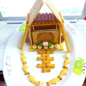 这时只能发挥想象了。大家有番茄酱或是美乃滋呀奶油之类的。可以粘一下。比较紧。可以教宝宝玩。我这款是两块长方形的做木板,左右墙是用正方形的。前面是用小点的长方形。阁楼用木棍型。用两块圆形饼干做墙支撑。