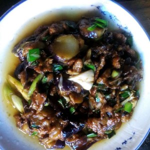 放入炸好沥干的茄子翻炒,不能大火中火就好