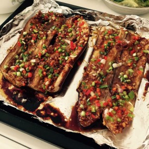 酱汁浇在茄子上,撒点黑胡椒粉。