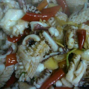 把鱿鱼倒入正在炒的泡椒里面,加料酒,炒个10分钟左右,加鸡精…再炒一下,出锅