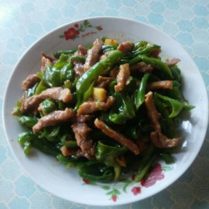 下炒过的青椒丝同炒匀。调入盐与糖(剩下的一半)炒匀后,再淋入水淀粉勾薄芡,炒匀即可出锅。