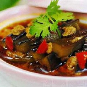 茄条烧至入味全熟时,调入鸡精后用水淀粉勾薄芡,淋香油