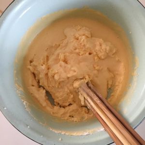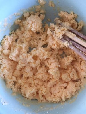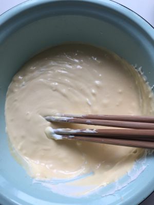 将做好的奶糊凉后倒入打发的淡奶油中 加入融化的黄油和乳酪搅拌均匀 加适量糖粉