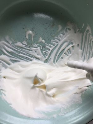 淡奶油打发 少量淡奶油就足够 因为做的是两人份 小萱子就只打发了大约80ml的淡奶油 雀巢淡奶油好打发 隔冰打更快 建议用筷子打半发就可以了