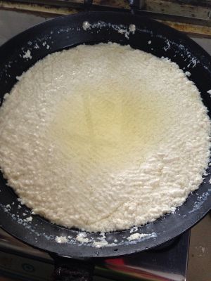 把豆浆入容器,我是放炒菜锅里。然后把沊水适量兑水,最好用豆浆兑。「我们那里是用沊水,有的地方是用石膏,有的是用酸汤」用小勺慢慢往豆浆锅里均匀搅拌。注意:一次不要下太多,太快。