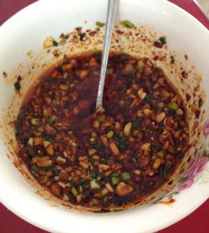 辣椒面,姜蒜末,盐,味精适量,把花生米用油炸过后拍碎,放入辣椒面,调匀,倒入烧热到8成热花生油,拌匀。下葱花。如果有木香油的可以放一点。