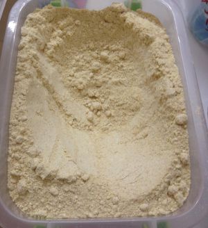 妈妈老家带过来的黄豆已经磨成粉,用水泡10-20分钟。