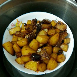 1,肉切厚一点,大概两厘米宽,小火慢慢煸炒,然后把溢出的多余猪油盛起(可以炒青菜用),炒到两面微微发黄时把肉盛起,锅里倒点油,放入生姜丝,大蒜,八角一半(3小片),陈皮3条丝,丁香2个,香叶1小片,干辣椒一个切3小段,花椒15粒左右。倒入2小勺白糖小火炒糖色,再倒入肉,倒入料酒,倒入土豆, 大红枣一个,切小块状倒入, 倒老抽加点水一起红烧。加盐,加鸡精,红烧得差不多了盛起装盘放在高压锅里隔水蒸15分钟。出锅。