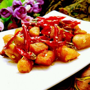 迅速倒入炸好的鸡块,放一点点生抽,芝麻,葱花,再放一点点糖,了中和辣味。干辣椒很容易糊,所以一定快。