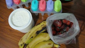 自制无糖浓稠酸奶500克,熟到表皮发黑的香蕉四根,前十来天碰到一次非常好吃的草莓,当时就决定留一部分冻起来做冰棍儿吃,就是洗净沥干水份后装袋冷冻就行了。