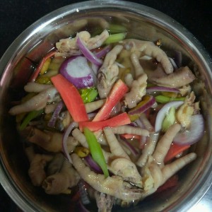 凤爪去指甲后放锅里煮熟,熟后捞出来用冷水冲凉凤爪