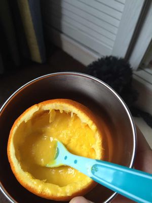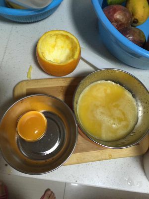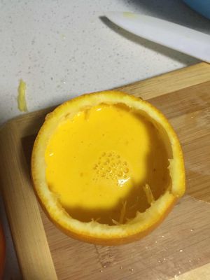 把蛋黄和橙汁搅拌均匀,倒入橙皮内