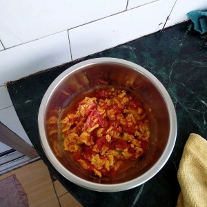 倒油 先炒鸡蛋 盛出锅 放入葱 西红柿 少许盐 酱油 翻炒至出些许汤