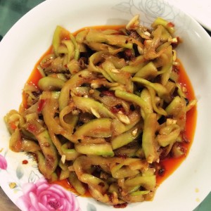 把锅烧热后倒入香油然后放入豆瓣海椒,等待油变成红色就倒入西瓜皮上拌匀。一盘美味的凉拌西瓜皮就大功告成了!