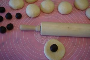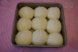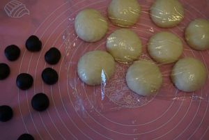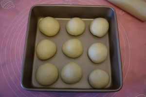 发酵好的面团拿出排气分成9个同样大小的面团滚圆盖保鲜膜松弛15分钟,松弛面团的同时把红豆沙也均匀分成9个同样大小的圆球