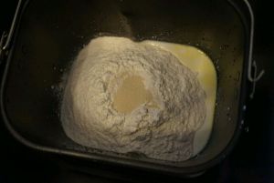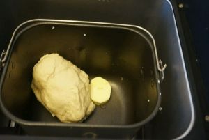 除黄油外把材料按液体到粉类添加到面包机桶启动一个和面程序