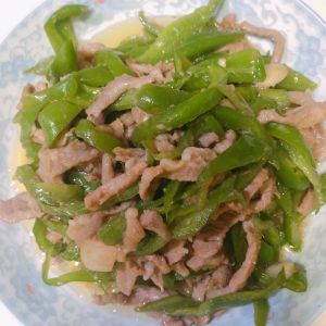 下油热锅,将大蒜倒入锅中爆香,再倒入腌好的肉丝翻炒,肉丝变色后再倒入青椒翻炒3分钟,并加入盐、醋和糖。