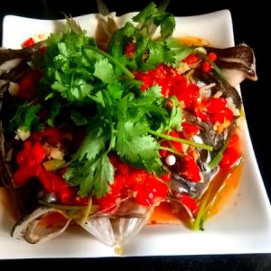 热锅烧油爆香剁椒小米辣,加适量盐和酱油。铺在鱼头上面。