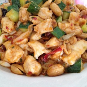 在倒入黄瓜丁和花生,还有大葱片翻炒、如果干可以加点儿水