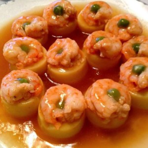每个虾仁上放一颗青豆做点缀
