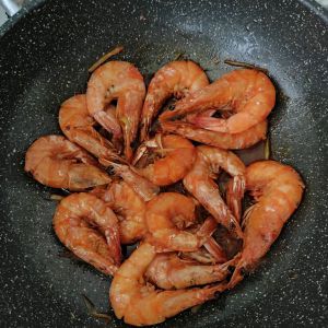 锅内倒入油,油热放入大虾,煎至两面金黄(翻面),压出虾油。放入葱丝、姜丝,均匀倒入料汁。盖上锅盖小火5分钟,撒入葱花、芝麻,完成✅