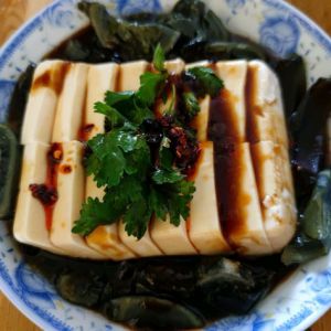 调好的汁淋在豆腐上,撒上香菜,辣酱油 。上桌吃饭了