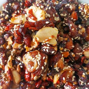 加入干辣椒花椒,用小火炒,辣椒变色后加入鸡腿肉