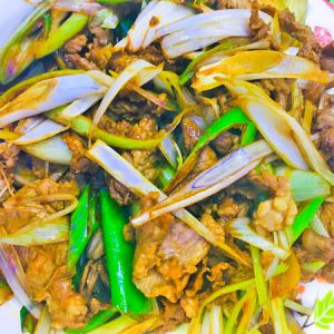 热锅加热放入葱姜炒香,放入羊肉爆炒,放入盐、生抽老抽,一点白糖。