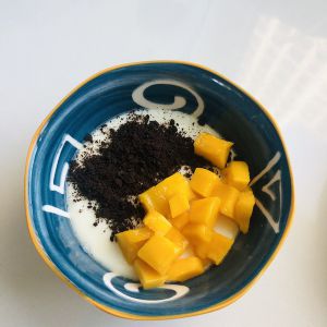 蒸好拿出来,放入奥利奥碎,和自己喜欢的水果丁,就可以享用啦