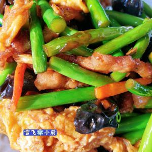 放入蒜薹段(必须是生的才好吃,汆熟的做法属于画蛇添足)开大火翻炒至蒜薹从黄绿色变为翠绿色加木耳