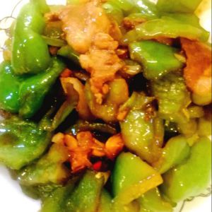 倒入青椒,翻炒,倒入适量的水,盖住10左右起锅