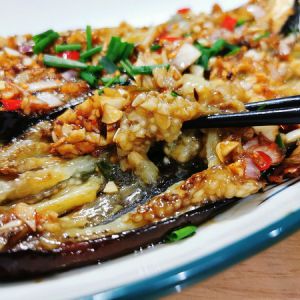 把烤箱中烤软的茄子〖上面第三步〗拿出来,把调料放入茄子上,