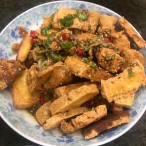 油热后豆腐下锅,炸5分钟左右,色焦黄取出,牙签扎几个孔,把之前做好的蘸料倒在豆腐上,拌匀即可
