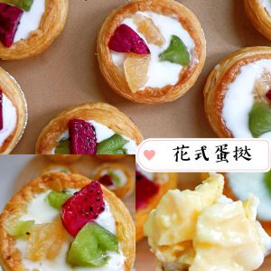 ②蛋挞出炉,上面铺满酸奶加入水果装饰即可